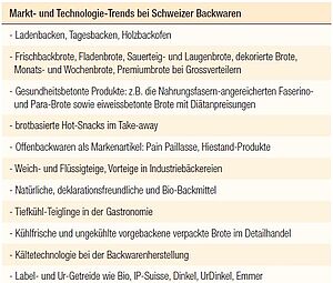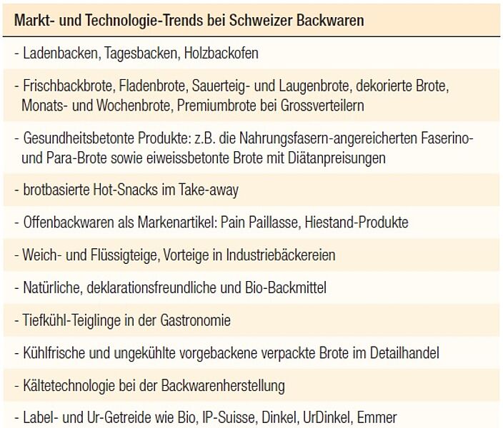 Ein Beispiel für eine herausragende Schweizer Leistung ist die TK-Teiglingtechnologie, deren Fundament von Fredy Hiestand stammt. Aber es gibt Schwachstellen: Schweizer haben einerseits Mühe mit der Marken-Generierung und andererseits mit dem Export von Frischbackwaren. Ausnahmen bei Markenbroten sind das Pain Paillasse, allgemein bei Backwaren die Marke Betty Bossi und seit Kurzem das vorverpackte Happy Brot der Migros mit verlängerter Frischhaltung. Die Schweiz importiert auch Frischbackwaren, so vor allem Toastbrote von Ölz. Zwei Drittel des Frischbackwaren-Absatzes erfolgt über Grossverteiler oder alternative Kanäle gemäss dem Verband der gewerblichen Bäckermeister SBC. Das Gewerbe positioniert sich mit einer Qualitätsstrategie, verwendet regionale Rohstoffe, produziert täglich mehrmals frisch vor Ort, verfügt damit über kurze Vertriebswege und pflegt den persönlichen Bedienungs- und Beratungsverkauf. Aber der Konzentrationsprozess schreitet weiter voran, die Betriebe werden grösser. Vor allem «Low carb» und glutenfreie Produkte bedrohen den Brotkonsum: Durch starke Trendsetter im Buchmarkt und auf Social Media sind diese Trends zu Lifestyle-Moden geworden, die weit mehr Menschen ansprechen als die effektiv betroffenen Diätetiker. Und der Import von Halb-/Fertigprodukten ist in 15 Jahren um das 2,5-fache gestiegen. Dies einerseits wegen des Margendrucks in Gastronomie und Hotellerie und andererseits weil bei warmem Brot in Supermarkt-Backstationen Qualitätsunterschiede schwierig festzustellen sind.