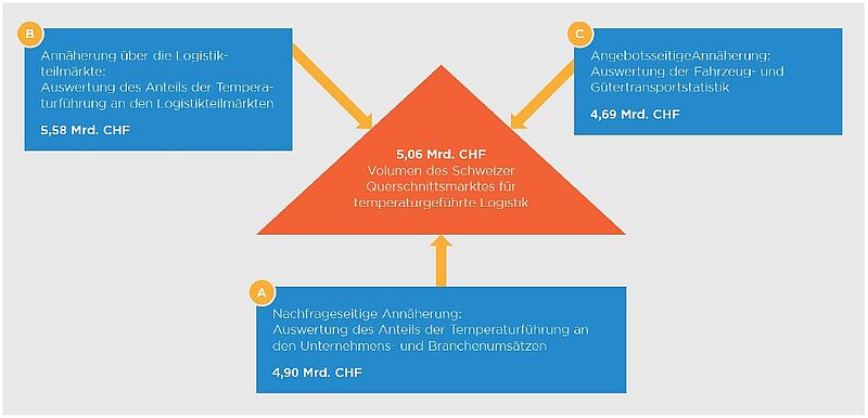 - Die Abschätzung des wertmässigen Volumens des Querschnittsmarktes für temperaturgeführte Logistik (Tiefkühl-, Kühl- und Wärmelogistik) erfolgt in der Logistikmarktstudie Schweiz über drei unabhängige Wege, um so die «Robustheit» des Ergebnisses zu gewährleisten: