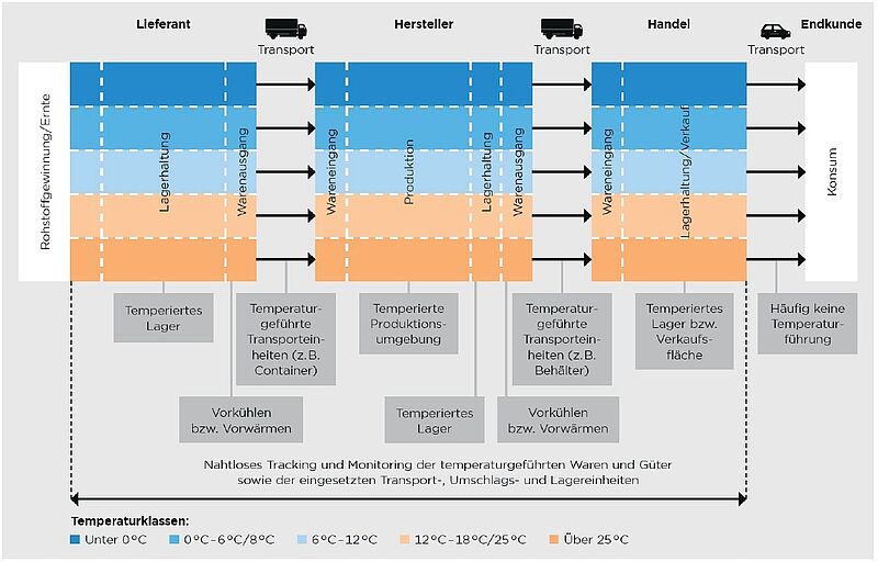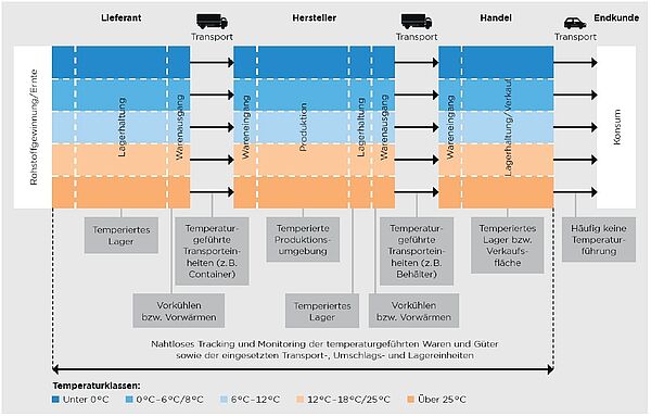 - Die Anforderungen, welche an die temperaturgeführte Logistik gestellt werden, sind hoch. Die vermutlich grösste Herausforderung und zugleich wesentliches Unterscheidungsmerkmal zwischen temperaturgeführten und nicht temperaturgeführten Supply Chains ist die Erfordernis einer durchgängigen Temperaturführung.