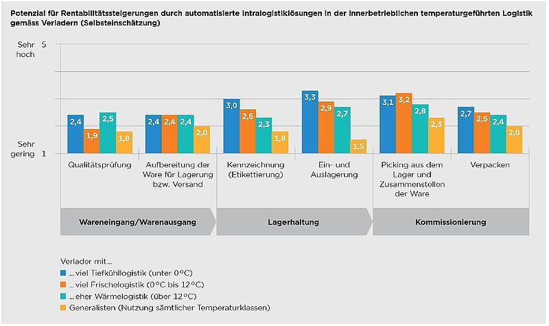 - Im Tiefkühlbereich lassen sich gewisse Skaleneffekte aus einer Automatisierung schneller realisieren als in anderen Temperaturklassen, da aufgrund höherer Kosten ein grösserer Durchsatz erforderlich ist und Automatisierungslösungen hier als probates Mittel für Effizienzsteigerungen gelten.