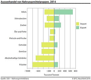 Gemäss dem Agrarbericht 2016 des Bundesamtes für Landwirtschaft BLW hat der Schweizer Aussenhandel im 2015 nach Jahren mit einem moderaten Wachstum abgenommen: Die Ein- und Ausfuhren waren mit 166,3 beziehungsweise 202,9 Milliarden Franken um 6,9 Prozent respektive 2,6 Prozent tiefer als 2014. Die Handelsbilanz schloss 2015 mit einem Exportüberschuss von 36,6 Milliarden Franken ab, das entspricht 6,6 Milliarden mehr als 2014. Der Handel mit landwirtschaftlichen Erzeugnissen hat sich im Berichtsjahr insgesamt negativ entwickelt. Gegenüber 2014 sanken die Importe wertmässig um 0,6 auf 11,5 Milliarden und die Exporte um 0,3 auf 8,5 Milliarden. Die Handelsbilanz bei den Landwirtschaftsprodukten schloss 2015 mit einem Importüberschuss von 3 Milliarden Franken. Das sind 0,3 Milliarden weniger als 2014. Insgesamt ist der Importüberschuss zwischen 2000 und 2015 aber um 2 Milliarden zurückgegangen.