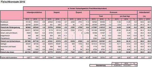 Beim Kalbfleisch und beim Schweinefleisch gingen die Inlandanteile 2016 leicht zurück, lagen mit 97,1 beziehungsweise 95,8 Prozent aber immer noch überdurchschnittlich hoch. Beim Rindfleisch stammten 82 Prozent aus einheimischer Produktion, was einer Zunahme von 1,4 Prozent entsprach. Am deutlichsten legte mit 2,2 Prozent der Inlandanteil beim Geflügelfleisch zu, welches mit 57 Prozent inländischer Produktion jedoch noch ein bedeutendes Ausbaupotenzial aufweist.