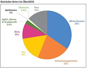 Von den rund 28 Millionen Hektolitern oder 2 800 000 000 Litern entfallen über 970 000 000 Liter und somit mehr als ein Drittel auf den Konsum von natürlichem Mineralwasser. Über 600 000 000 Liter machen die Erfrischungsgetränke aus, wobei diese ohne Eistee, Fruchtsäfte, Nektare, Energydrinks und isotonische Getränke gezählt werden. Mit rund 460 000 000 Litern ist Bier die drittgrösste Fraktion, gefolgt vom Wein mit 290 000 000 Litern. Von den Apfel-, Birnen- und Traubensäften werden 72 000 000 Liter konsumiert. Spirituosen mit 30 000 000 Liter und 10 000 000 Liter Obstwein kommen noch dazu.