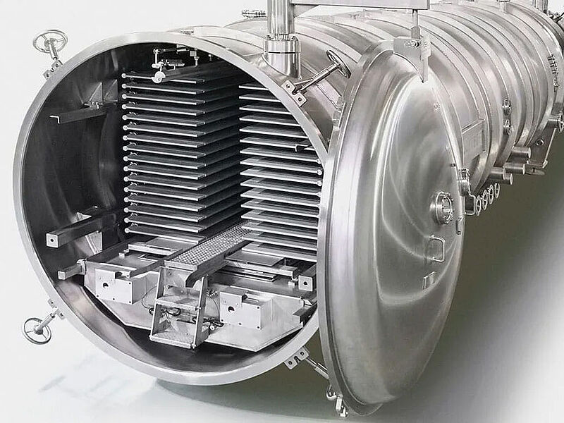 Die RAY-Einheit selbst besteht aus einem zylindrischen Gefriertrocknungsschrank mit einer Tür an der Vorderseite für das Be- und Entladen der Produktschalen. Die Anlage wird standardmässig mit unserem voll ausgestatteten Steuerungs- und Automatisierungssystem geliefert, das eine Rezepturfunktion und eine vollständige Chargenprotokollierung sowie Datenmanagement- und Visualisierungstools umfasst.