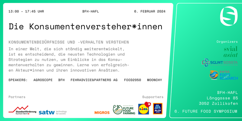 Am 6. Februar findet das Future Food Symposium: "Die Konsumentenversteher und -versteherinnen" bei der BFH-HAFL, Länggasse 85, 3052 Zollikofen um 13:00 – 17:45 statt. Gerne laden wir zu diesem Anlass ein.
